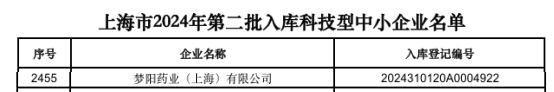 近日,上海市科學技術委員會發布了《關于上海市2024年第二批入庫科技型中小企業的公告》,夢陽藥業(上海)有限公司順利通過評審,入選“科技型中小企業”名單。