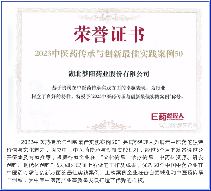 由中國醫(yī)藥企業(yè)管理協(xié)會、中國醫(yī)藥生物技術(shù)協(xié)會、杭州市投資促進(jìn)局、杭州市臨平區(qū)商務(wù)局主辦,E藥經(jīng)理人、中國醫(yī)療健康產(chǎn)業(yè)投資50人論壇承辦的2023“第十五屆中國醫(yī)藥企業(yè)家科學(xué)家投資家大會”于11月1-3日在杭州隆重舉行。夢陽藥業(yè)董事長張敏受邀參加并在2023首屆中醫(yī)藥CEO論壇上針對當(dāng)前中藥行業(yè)面臨的政策、資本、現(xiàn)代化、研發(fā)創(chuàng)新、高質(zhì)量發(fā)展等挑戰(zhàn)進(jìn)行了討論和分享。會上,由E藥經(jīng)理人發(fā)起主辦的頒獎儀式上,夢陽藥業(yè)榮膺“2023中醫(yī)藥傳承與創(chuàng)新最佳實(shí)踐案例50”殊榮。
