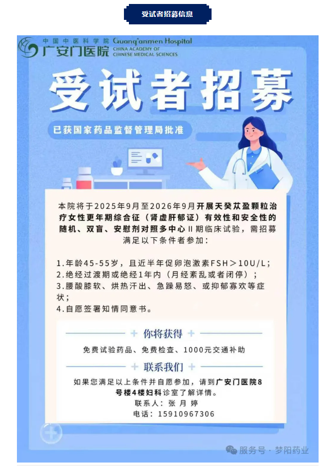 2025年10月20日,由中國中醫科學院廣安門醫院牽頭,全國10余家三甲醫院共同參研的“評價天癸蓯盈顆粒治療女性更年期綜合征(腎虛肝郁證)有效性和安全性的隨機、雙盲、安慰劑對照多中心Ⅱ期臨床試驗”完成首例受試者給藥。