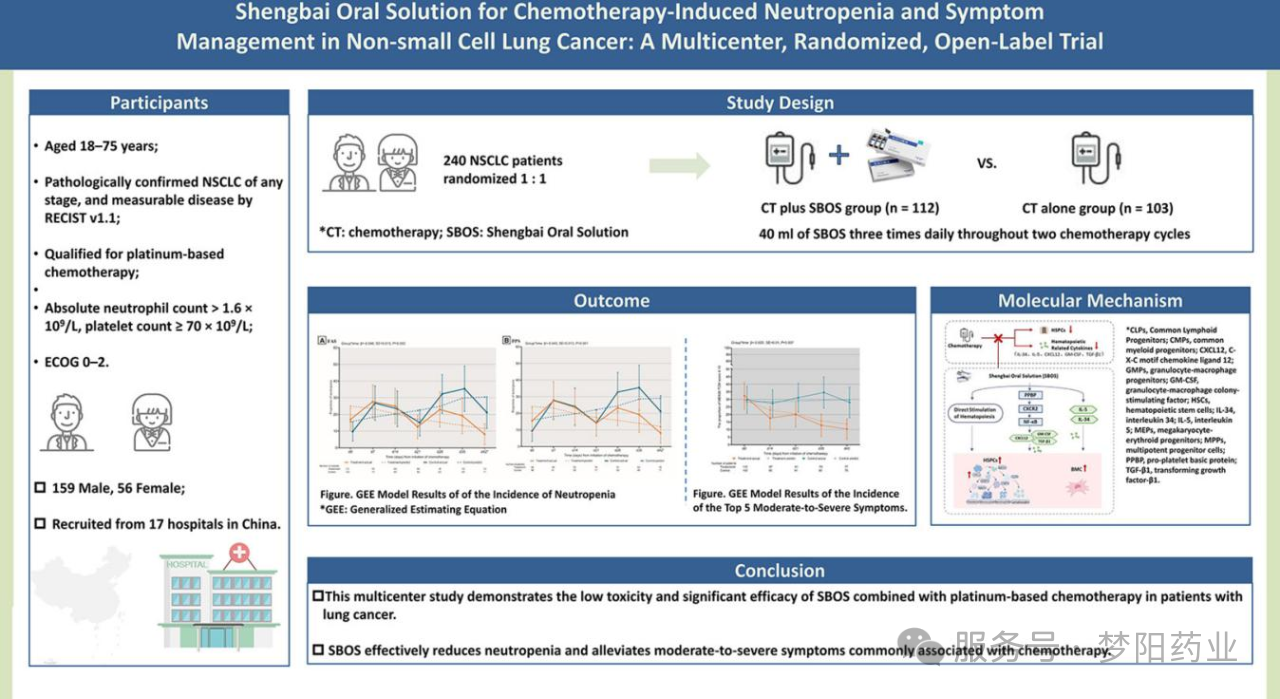 從“System pharmacology reveals the mechanism of action of Shengbai Oral Liquid alleviates chemotherapy-induced leukopenia by interfering the pro-platelet basic protein: Integrated network study of multi-omics”(Journal of Ethnopharmacology,IF=5.4,JCR Q1)通過多組學(xué)和網(wǎng)絡(luò)藥理學(xué)結(jié)合的綜合策略深入研究生白口服液(SBOL)治療白細(xì)胞減少癥的機(jī)制研究,到“Shengbai oral solution for chemotherapy-induced neutropenia and symptom management in non-small cell lung cancer: A multicenter,randomized, open-label trial”(Phytomedicine,IF8.3,JCR Q1)多中心、隨機(jī)、開放性臨床試驗,夢陽藥業(yè)一直秉持“提高腫瘤患者的生活質(zhì)量”的使命,夯實基礎(chǔ)研究、持續(xù)提供臨床循證證據(jù),用優(yōu)質(zhì)的產(chǎn)品為人類健康事業(yè)貢獻(xiàn)智慧與力量!