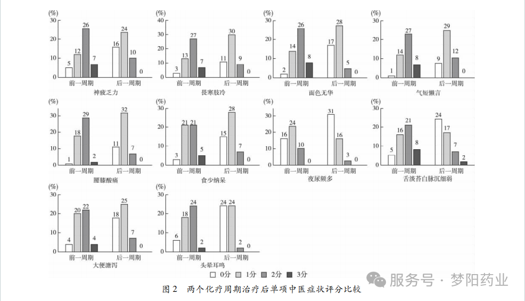 結(jié)果 兩個化療周期相比,后1周期白細胞、中性粒細胞、血小板在化療第14天的數(shù)值明顯高于前1周期,差異有統(tǒng)計學意義(P<0. 05) ; 后1周期3~ 4級骨髓抑制的發(fā)生率為4. 0%,明顯低于前1周期的22. 0%,可顯著減少G-CSF用量,差異有統(tǒng)計學意義(P<0. 05) 。后1周期的中醫(yī)癥狀改善有效率為98. 0%,明顯高于前1周期的54. 0%,差異有統(tǒng)計學意義(P<0. 05) ,中醫(yī)癥狀總積分明顯低于前1周期且變化更為顯著,差異有統(tǒng)計學意義(P<0. 001) 。后1周期KPS評分有效率為92. 0%,明顯高于前1周期的72. 0%,差異有統(tǒng)計學意義(P<0. 001) 。